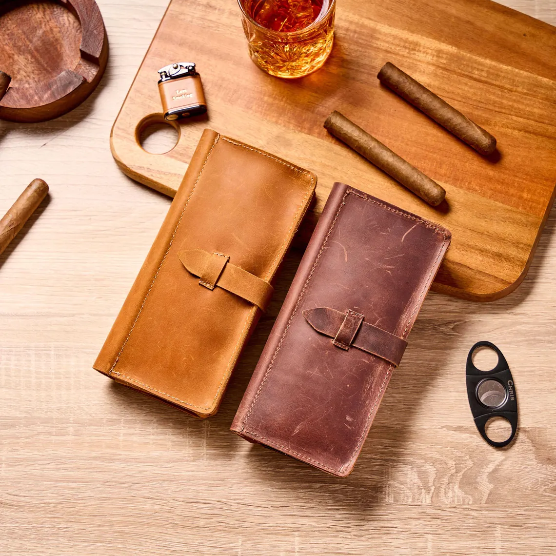 Expertly fashioned from genuine full-grain leather, this versatile case not only safeguards your cigars during travel but also ensures they remain at ideal humidity levels. Its compact, foldable design unfolds to reveal a spacious interior, offering both protection and convenience without compromising on style. Add a custom engraved monogram or initials for a truly personal touch that speaks to refinement and thoughtfulness.